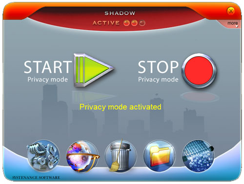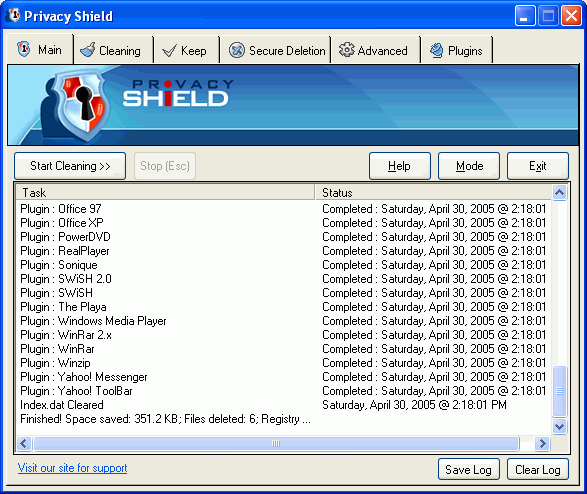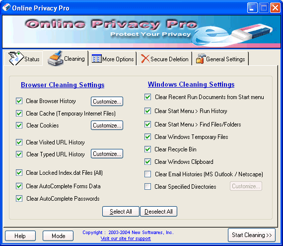 Total Privacy protects your privacy by cleaning up all the tracks of your Internet and system activities. It can clean your browser's cache, cookies, web forms data, entries in your recent documents history, recent applications history, find files history, your temporary files, recycle bin, clean recent documents lists for popular applications, can recover Hard Disk space, and many more.