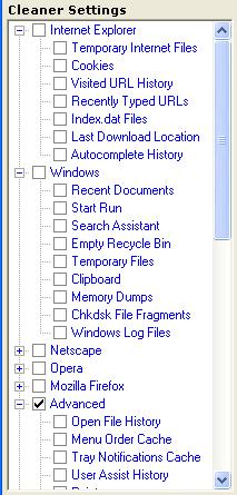 Clean: Deletes files, cookies, and lists of recently used files